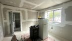 Просторен дневен тракт, интегриран с кухненски бокс, осветен от френски прозорци.